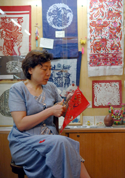 Chinese paper-cutting artist Liu Ren works at home in Beijing, capital of China, June 8, 2006. As an infatuate of Chinese traditional paper-cutting, Liu Ren set up a paper-cutting home museum in 1999 for the purpose of carrying forward the traditional handicraft and sharing with others the joy brought by paper-cutting. Fanciers of Chinese paper-cutting from more than 30 countries and regions have visited her household museum after its establishment.[Xinhua Photo]
