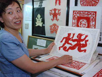 Chinese paper-cutting artist Liu Ren (L) is invited to take part in an activity for the Chinese Cultural Heritage Day with her creations in Beijing, capital of China, June 10, 2006. [Xinhua Photo]