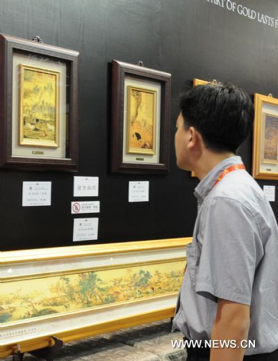 A visitor watches golden paintings exhibited by Taipei's National Palace Museum during the first day of the 3rd Cross-strait cultural industry expo and trade fair in Xiamen, southeast China's Fujian Province, June 19, 2010. (Xinhua/Zhang Chencen)