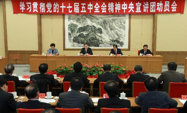 Li Changchun (2nd L back), a member of the Standing Committee of the Political Bureau of the Communist Party of China (CPC) Central Committee, speaks as he attends a meeting for a nationwide publicity campaign to educate the public on the guiding principles of the Fifth Plenum of the 17th CPC Central Committee, in Beijing, capital of China, Nov. 30, 2010. (Xinhua/Pang Xinglei)