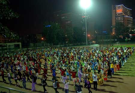 Students of Central University for Nationalities attend a rehearsal for the upcoming National Day massive celebration, in Beijing, Sept. 22, 2009. A massive celebration will be held in Tian'anmen Square on Oct. 1 for the 60th anniversary of the founding of People's Republic of China.(Xinhua Photo)