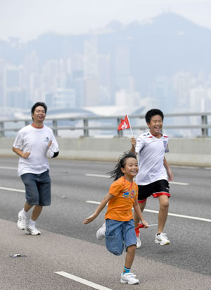 Local residents walk on the eastern corridor of Hong Kong, south China, on Sept. 27, 2009. More than 13,000 people took part in the charity walk activity held here on Sunday to celebrate the 60th anniversary of the founding of the People's Republic of China. (Xinhua/Lui Siu Wai)