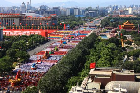 Floats take part in a parade of the celebrations for the 60th anniversary of the founding of the People's Republic of China, on Chang'an Street in central Beijing, capital of China, Oct. 1, 2009. (Xinhua/Li Mingfang)