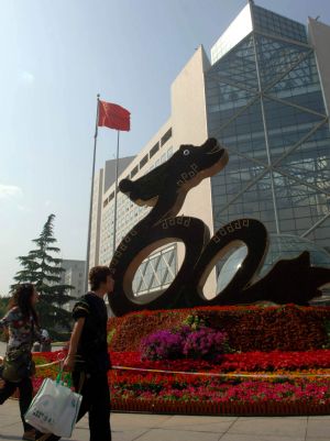 People walk past a huge parterre in Beijing, capital of China, Sept. 14, 2009. More than 40 million flowers will decorate the city for the celebration of the 60th anniversary of the founding of the People's Republic of China, which falls on Oct. 1. (Xinhua/Gong Lei)
