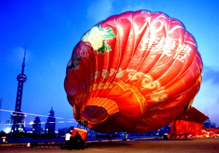 A huge hot-air balloon is raised in Shanghai, east China, Sept. 19, 2009, during a celebration of the 60th anniversary of the founding of the People's Republic of China.(Xinhua/Zhang Ming)