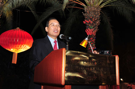 Chinese Ambassador to Israel Zhao Jun (C) speaks during a reception held by the Chinese Embassy to mark the 60th anniversary of the founding of the People's Republic of China, in Tel Aviv, Sept. 24, 2009. (Xinhua)
