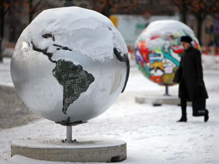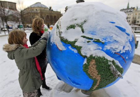 People clean the snow from a globe in Copenhagen December 17, 2009. Copenhagen is the host city for the United Nations Climate Change Conference 2009, which lasts from December 7 until December 18. (Xinhua/Reuters Photo)