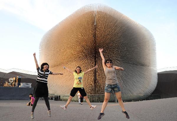 Visitors have photos taken outside the Seed Cathedral, the pavilion of the United Kingdom, at the Expo Park in east China's Shanghai Sept. 9, 2010. (Xinhua/Lin Yiguang)