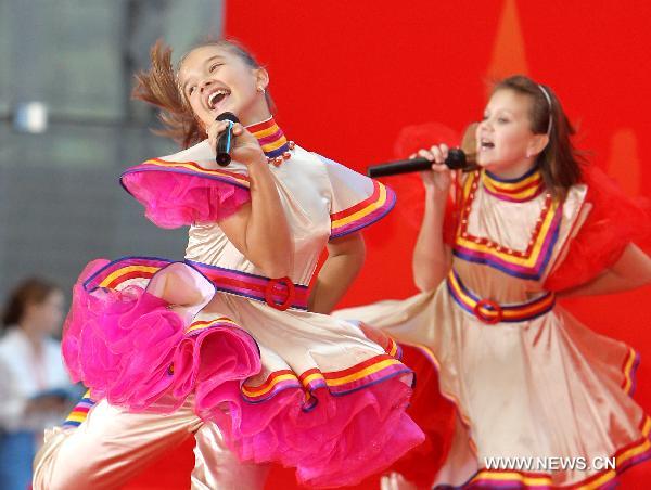 Actress from Russia perform during a ceremony celebrating the National Pavilion Day of Russia in the World Expo Park in Shanghai, east China, Sept. 28, 2010. (Xinhua/Fan Jun)