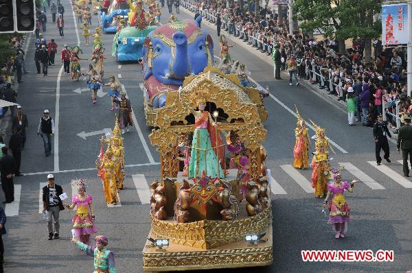 Photo taken on Oct. 31, 2010 shows the last float parade of the Shanghai Expo at the World Expo Park in Shanghai, east China. The 184-day Shanghai World Expo 2010 is set to be closed here Sunday. The Shanghai Expo is the first time the event has been held in a developing country, drawing 246 countries and international organizations, as well as more than 70 million visitors. (Xinhua/Wang Jianhua)