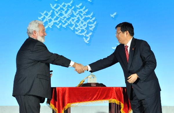 Yang Xiong (R), the deputy director of the executive committee for Shanghai Expo and vice mayor of Shanghai shakes hands with Vicente Loscertales (L), secretary-general of the Bureau of International Expositions (BIE), after presenting a gift, during an awarding ceremony in the World Expo Park in east China's Shanghai Municipality, Oct. 30, 2010. (Xinhua/Zhang Guojun)