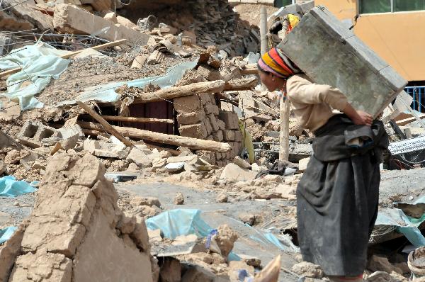 A woman collects her belongs in Gyegu Town, the quake-hit Tibetan Autonomous Prefecture of Yushu, in northwest China's Qinghai Province, April 17, 2010. The 7.1-magnitude earthquake that struck Yushu of Qinghai Province, left 1,484 dead and 312 still missing, and about 100,000 people were relocated. (Xinhua/Liu Siyang)