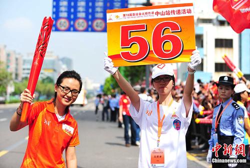 At nine o'clock this morning, the torch, dubbed "The Tide" was lit and displayed by CPC Zhongshan Committee Secretary Chen Genkai. He then handed it over to the first bearer, Olympic badminton champion Yang Wei.