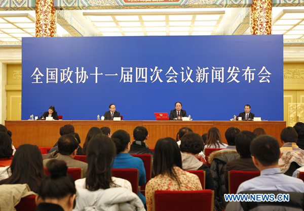 Zhao Qizheng (2nd R), spokesman of the Fourth Session of the 11th Chinese People's Political Consultative Conference (CPPCC) National Committee, speaks during a news conference on the CPPCC session at the Great Hall of the People in Beijing, capital of China, March 2, 2011. The Fourth Session of the 11th CPPCC National Committee is scheduled to open on March 3. (Xinhua/Chen Jianli)