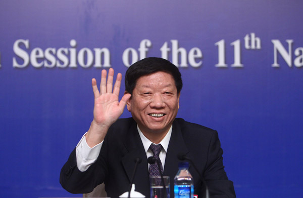 Chinese Minister of Human Resources and Social Security Yin Weimin answers questions during a press conference of the Fourth Session of the 11th National People's Congress (NPC) on employment and social security system construction in Beijing, capital of China, March 8, 2011. (Xinhua/Xing Guangli)