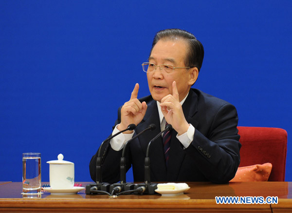 Chinese Premier Wen Jiabao answers questions during a press conference after the closing meeting of the Fourth Session of the 11th National People's Congress (NPC) at the Great Hall of the People in Beijing, China, March 14, 2011.(Xinhua/Wang Ye)