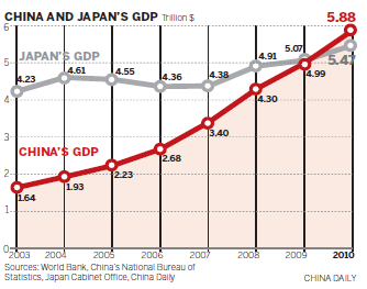 Japan's gross domestic product (GDP) reached $5.47 trillion last year, compared to $5.88 trillion for China, Japan's Cabinet Office said on Monday. Japan became the world's second largest economy, after the United States, in 1968 on the back of its post-war recovery.