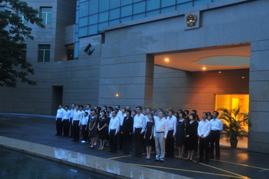 在王小龍臨時代辦帶領(lǐng)下,全體館員冒雨在使館辦公樓前整齊肅立,凝望國旗升至旗桿頂端后降下。大家懷著無比沉痛的心情,深切悼念甘肅舟曲特大山洪泥石流遇難同胞。