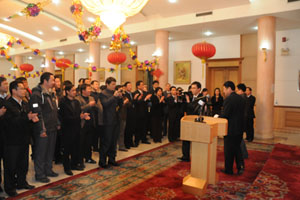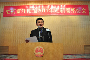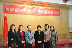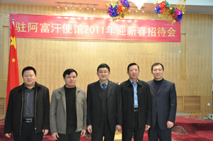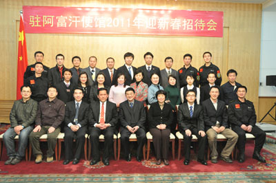 2011年1月21日晚,中國駐阿富汗使館內(nèi)張燈結(jié)彩、歡樂喜慶。駐阿富汗大使鄭清典為全體在阿華人華僑和中資機(jī)構(gòu)代表舉辦盛大的2011年春節(jié)招待會(huì)。中冶江銅、中鐵十四局、中興通訊、華為技術(shù)等中資機(jī)構(gòu)代表、新華社、中央電視臺(tái)記者、旅阿華人華僑及使館全體人員歡聚一堂,喜迎農(nóng)歷兔年新春。