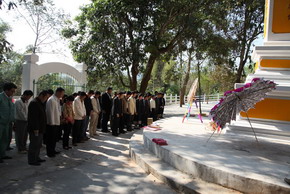 為緬懷先烈,中國駐老撾使館每年清明節派人前往祭掃。今年是中老建交50周年,也是中國共產黨成立90周年,駐老撾使館以此為契機,同老方聯合舉辦祭掃活動,旨在繼承革命先烈遺志,鞏固中老傳統睦鄰友好,弘揚國際主義和愛國主義精神,更加具有現實意義。 |
