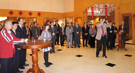 高總向僑界志愿者和文藝社團負責人祝賀新春,感謝其為傳播中華文化、促進中美文化交流合作和推動和諧僑社建設所做的努力和工作,贊揚其不計名利,無私奉獻,積極發揮中華文化傳播者和中美友好使者的作用,特別是為“中美友好之夜”系列活動做出貢獻。高總說,大休斯敦地區有20多萬華僑華人,每年舉行國慶、中秋、新春晚會和游園會等各種僑社文化活動,志愿者們功不可沒。中國總領館將繼續支持和鼓勵僑社開展各種有利于弘揚中華優秀文化、促進中美友好關系、兩岸關系和平發展、和諧僑社建設的活動。希望大家為自己是中國人而自豪,以傳承中國文化為己任,通過傳播中國文化,提升自己的社會地位和影響力,給自己創造更美好的生活、工作和發展條件;僑社文化活動在自我娛樂的同時,也面向美國主流社會和其他族裔,不斷提高藝術水準;在認同一個中國、認同中華文化的大原則下,兩岸同胞一起舉辦各種文化活動;各僑社和睦相融,團結友愛,共同爭取和維護華僑華人的整體利益。