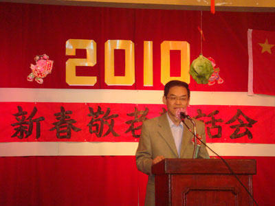李長華大使發表熱情洋溢的新春致詞。他說,今天是中華民族的傳統佳節-虎年新春,是倍思親的日子,很高興來到“新春敬老茶話會”的現場,和廣大僑胞、老僑胞歡度新春。“尊老愛幼”是 中華民族的優良傳統美德,我謹代表中華人民共和國駐哥斯達黎加使館向在座僑胞,特別是老僑致以新春祝賀。李大使回顧了新中國成立以來60年的艱辛歷程,從貧窮落后走向富強,中國人民在中國共產黨領導下,不斷探索求真,實行改革開放,勵精圖治,以堅韌不撥的意志和不畏艱辛的精神建設富強國家,尤其是2009為應對年世界金融危機,實行宏觀調控,擴大內需,使國民經濟保持增長,為世界經濟復蘇做出了貢獻。
