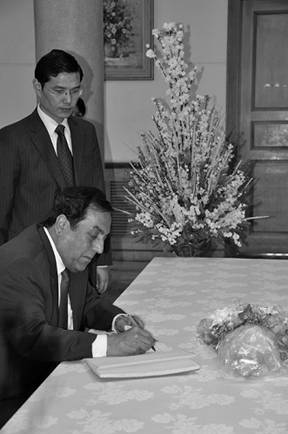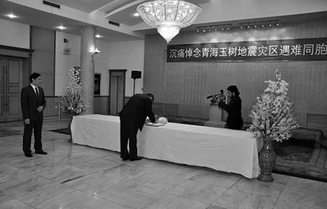 使館國旗徐徐降下,全體同志懷著無比悲痛的心情,肅立默哀三分鐘。隨后,在使館臨時布置的靈堂內,同志們面向懸掛著“沉痛悼念青海玉樹地震災區遇難同胞”的挽幅三鞠躬,并依次在哀思簿上留言,向地震遇難同胞致以沉痛哀悼。