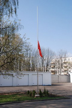 大地震動,江河嗚咽,草木哀鳴,蒼生泣血,舉國悲慟。今日的寒風格外凜冽,空氣也因哀傷而凝固。在駐白俄羅斯使館的小廣場上,全體館員身著素服,佩戴白花,面向青海玉樹方向整齊肅立。隨著鮮艷的五星紅旗徐徐下降,館員們懷著無比沉重和悲痛的心情默默哀悼,表達對受災同胞的無限哀思。