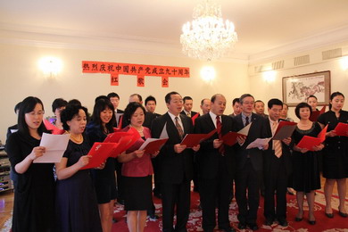 紅歌會上,總領館和進出口銀行代表處每位同志踴躍登臺,深情獻唱。《駿馬奔馳保邊疆》、《軍港之夜》、《我愛這藍色的海洋》、《大海啊故鄉》、《萬里長城永不倒》、《大海航行靠舵手》、《中國人》等一首首歌頌黨、歌頌祖國、歌頌人民的經典紅歌,抒發了對黨和祖國的無限熱愛,表達了對人民的無限忠誠。全體黨員合唱的《團結就是力量》、《我和我的祖國》、《我們走在大路上》、《沒有共產黨就沒有新中國》以及《歌唱祖國》充滿了昂揚斗志和愛國激情,將紅歌會推向一個又一個高潮。