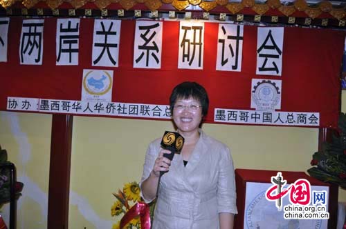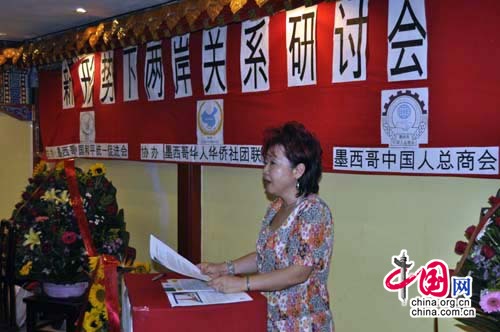 墨西哥華人華僑社團聯合總會執行會長初海燕在發言中指出,胡錦濤主席在十七大的報告中明確表示,“支持海外僑胞、歸僑僑眷關心和參與祖國現代化建設與和平統一大業。”我們旅居海外的華人華僑雖然身居異地,但心系祖國,渴望和平統一。我們在為生存,為拓展而終日奔波,辛勤拼搏的同時,有兩件事是我們最關心的:一是祖國的繁榮昌盛;二是祖國的和平統一。第一件事,我們已經看到了中國的經濟日新月異的發展,民富國強,作為東方巨人屹立世界民族之林;第二件事,祖國和平統一大業,因為臺獨勢力不會自己退出歷史舞臺,不會輕易踏上祖國統一的道路,所以祖國和平統一大業征途漫漫,任重道遠,還需要我們繼續不懈的努力。”