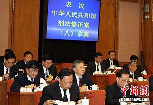 十一屆全國(guó)人大常委會(huì)第十九次會(huì)議25日下午經(jīng)表決,通過(guò)了刑法修正案(八)。此次刑法修改的重點(diǎn)之一是取消了近年來(lái)較少適用或基本未適用的13個(gè)經(jīng)濟(jì)性非暴力犯罪的死刑。中新社記者 任晨鳴 攝