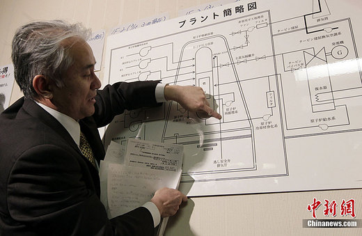 日本政府表示,當地時間15日晨6時10分左右,福島第一核電站2號反應堆附近傳來爆炸聲。早些時候的報道指出,福島第一核電站2號反應堆容器出現部分破損,這表明可能導致更為嚴重的核泄漏。圖為日本東京核電官員用結構圖講解福島第一核電站2號機組爆炸情況。