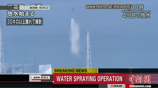東京電力公司稱,直升機灑水前的當地時間17日上午9時40分,福島核電站核輻射量數值為3782微西弗,灑水后30分鐘,在離第三反應堆數十米的同一地點進行了檢測,得到的數值為3754微西弗,放水前后的數值基本上沒有什么變化。