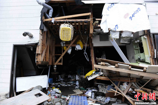 3月15日下午,日本巖手縣大船渡市受大海嘯襲擊后的一幢房屋。大船渡市緊鄰海港,是此次日本東北大地震中受災最嚴重的地區(qū)之一。中新社發(fā) 侯宇 攝
