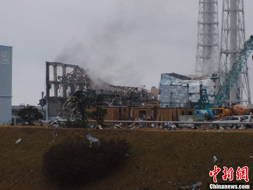3月21日,東京電力公司公布的福島第一核電站3號反應堆冒煙照片。當天,東京電力公司宣布,下午3點55分前后,福島第一核電站3號反應堆所在建筑物的東南側冒出灰煙,但是沒有聽到爆炸聲。