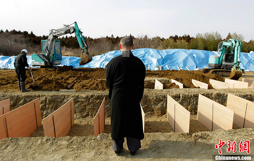 3月22日,宮城縣東松島市集中埋葬多名遇難者,日本僧侶在葬禮現場為遇難者祈禱。