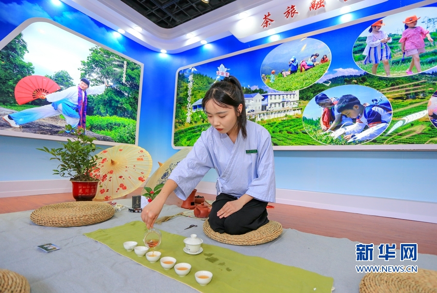 6月14日,茶文化體驗(yàn)館,茶藝師在茶席上向客商奉茶。新華網(wǎng) 肖和勇 攝