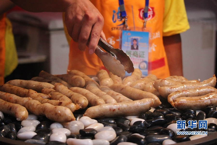 兩岸各大夜市的招牌美食集聚特色廟會,圖為鵝卵石上的香腸,香氣四溢。新華網 劉默涵 攝
