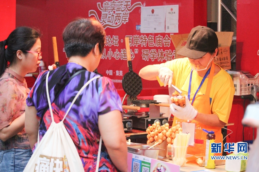 兩岸特色廟會吸引了許多人前來品嘗美食,圖為游客正在購買特色小吃“雞蛋仔”。新華網 劉默涵 攝