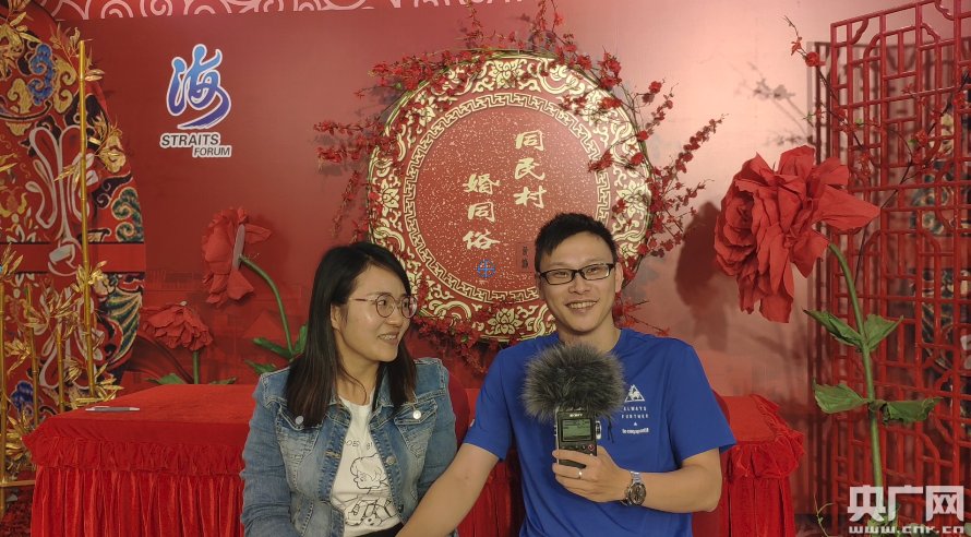 本場(chǎng)活動(dòng)共有12對(duì)同名(同宗)村的夫妻參加,其中大陸1對(duì),臺(tái)灣10對(duì),還有1對(duì)為兩岸婚姻家庭。來(lái)自臺(tái)灣臺(tái)南的小伙傅彥霖,四年前到福建工作,認(rèn)識(shí)了漳州姑娘黃藝超,他倆將在下下周舉辦婚禮,傅彥霖說(shuō)此次參加海峽論壇“同名村 婚同俗”活動(dòng),對(duì)他倆有特別的紀(jì)念意義。