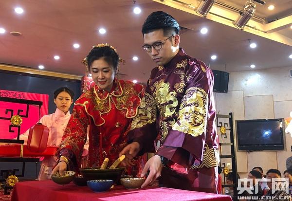 活動現場張貼了紅色對聯,布置得喜氣洋洋,還溫情加入了發放喜糖、分享喜餅等環節,營造出此次活動主題“婚同俗”的氛圍,增強兩岸鄉親同根同源的代入感。現場還進行了閩南、客家婚俗的表演,通過敬獻擂茶等環節讓參加活動的兩岸鄉親親身參與其中,加深對兩岸同根同源的認同和理解。