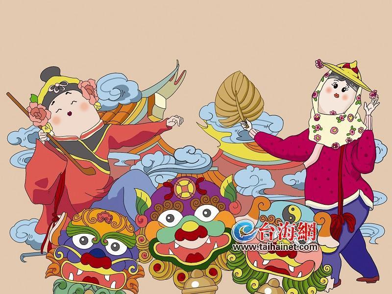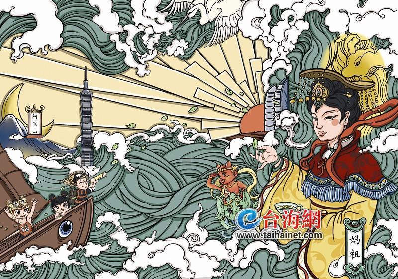 作品繪制了閩南漁女、風獅爺、媒人丑角,分別代表了閩臺民俗文化、信仰文化、戲劇文化。以祥云裊裊和特色建筑作為背景,從各方面展現了豐富多彩、同根同源的閩臺風情。