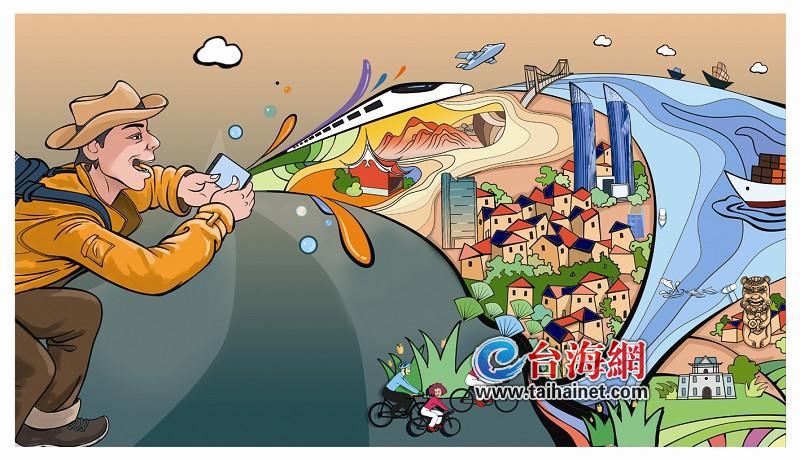以“閩臺一日生活圈”為創作靈感,畫面左側是往返于兩岸的游客,在這全民“拍、拍、拍”的打卡時代背景下,以游客視角領略海峽兩岸的滄桑巨變。畫面右邊,則有高鐵、單車、廈門雙子塔、金門莒光樓、海運、海豚等代表性元素。