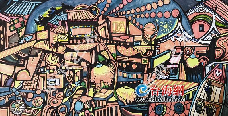 采用立體派的繪畫風格,組合了兩岸夜市的景象。熱鬧的攤位、高懸的燈籠、矗立的牌樓、參差的建筑、夜歸的船只……同樣的習俗,同樣的生活方式,同樣的人間煙火,同樣的打動人心。