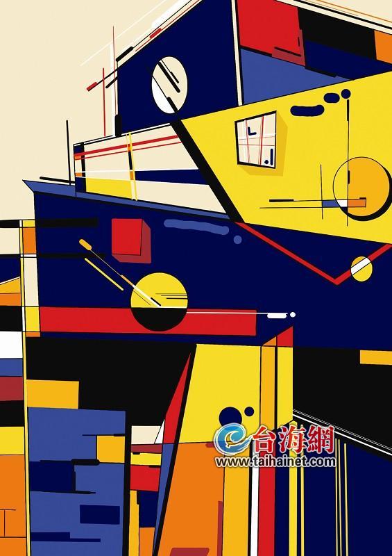 集裝箱是兩岸港口常見的意象,也是當今快節奏生活的縮影。在這幅作品中,它們不再是堅硬而冰冷的、抽象化的色塊,色彩熱烈而富有生機,冷與暖交織,表達兩岸青年新思想與生活激情的碰撞。
