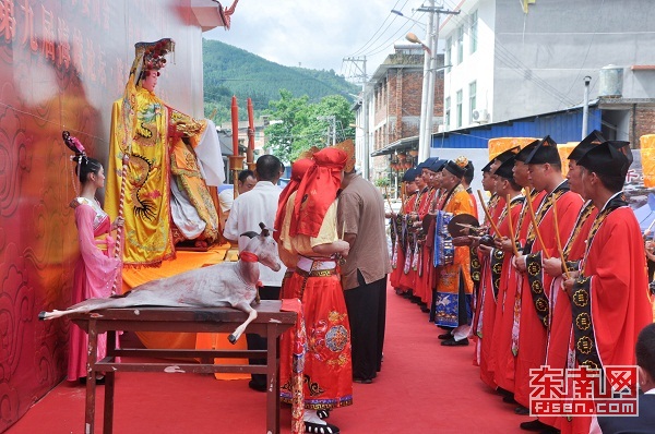 當天上午9時整,祭祀典禮儀式拉開了陳靖姑文化節的序幕。在陳靖姑金身像前,參祭人員循禮興、上馨香、獻三牲、三獻爵、敬頌祭文、行“三跪九叩”禮以及獻樂舞等傳統禮儀,依序展開祭典,兩岸民眾虔誠進香祭拜。
