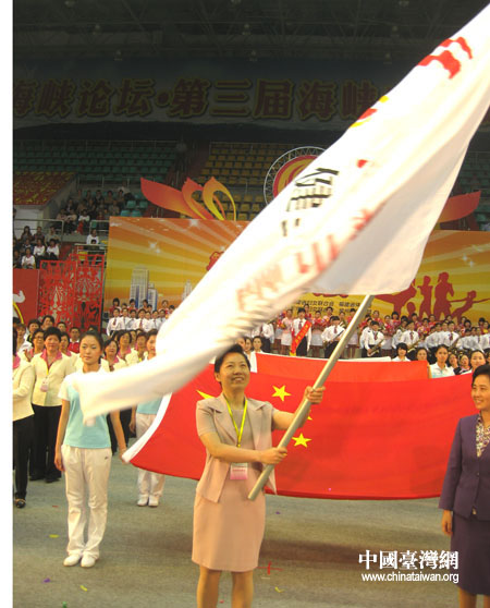 海峽巾幗健身大賽會旗交接儀式,下一屆舉辦城市龍巖接過會旗。中國臺灣網特約記者 蘭伯樂 攝