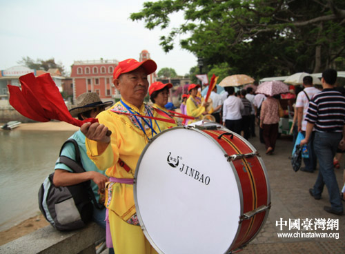 5月17日,來自海峽兩岸的民眾在廈門思明區鼓浪嶼舉行盛大頌典,共祭民族英雄鄭成功。由此,正式拉開了“鄭成功文化節”的大幕。圖為“夠勁兒”的鼓手大爺。(中國臺灣網 邵磌 攝)