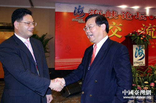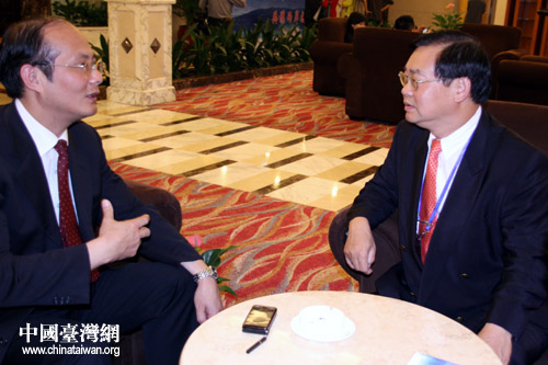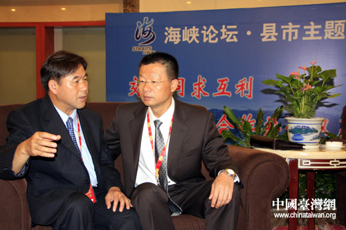 臺灣彰化縣副縣長張瑞濱(右)與江西鷹潭市副市長吳曉軍就兩地教育、農業合作熱烈攀談 (中國臺灣網 李徽 攝)