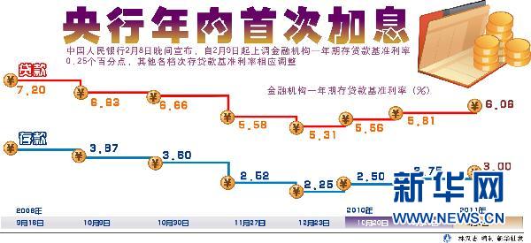 中國人民銀行8日晚間宣布,自9日起上調金融機構一年期存貸款基準利率0.25個百分點,其他各檔次存貸款基準利率相應調整。調整后,一年期存款利率達到3%,一年期貸款利率達到6.06%。